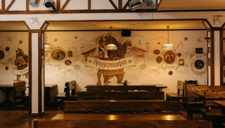Просторный и демократичный ресторан «Брудершафт», расположенный в здании визит-центра, работает с 9 утра и до позднего вечера. Здесь мы предлагаем нашим гостям очень аппетитные и вкусные блюда. Вы обязательно оцените не только местную кухню, но и теплую дружескую атмосферу, которая царит в ресторане!