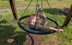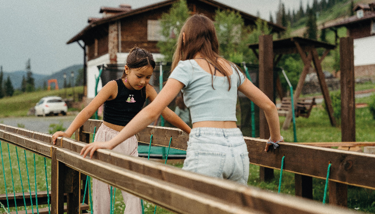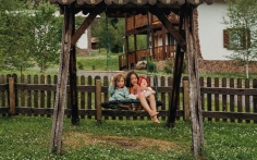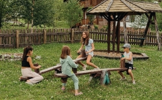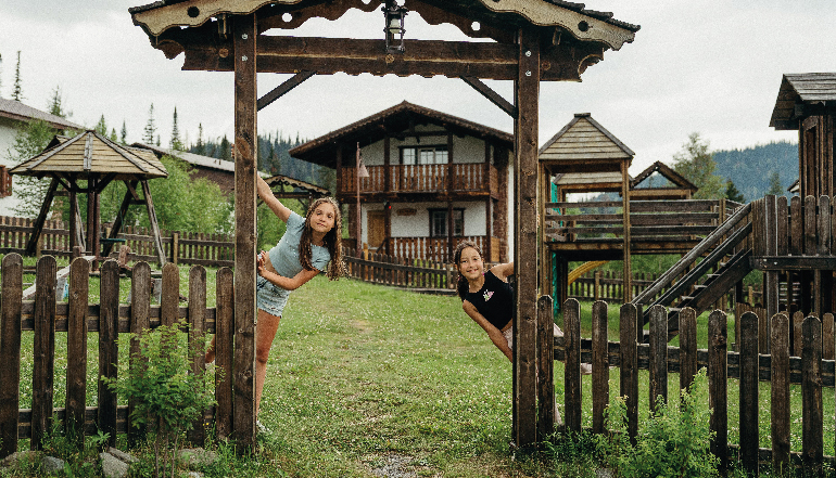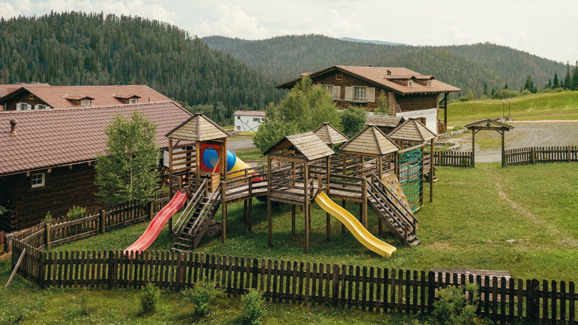 А как привольно будет погулять детям на уличной игровой площадке! Тут вам и качели, и песочница, и горки, и даже маленький домик со ставенками — почти всё рукотворное, сделано старательными мастерами-деревообработчиками Горной Саланги. Прямо как детские площадки в Альпах, что встречаются повсеместно и действуют круглый год!
