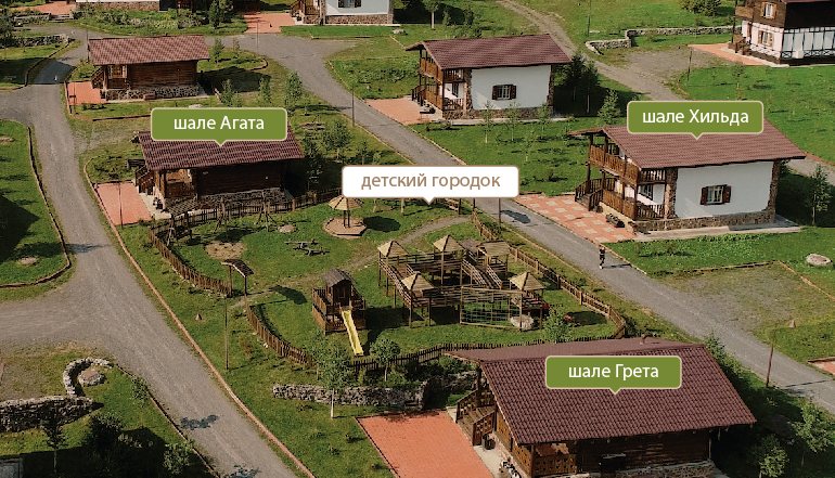Детская игровая площадка расположена на II линии домов Альпийской деревни, между шале Агата и Грета.