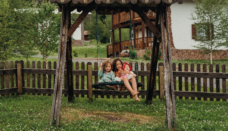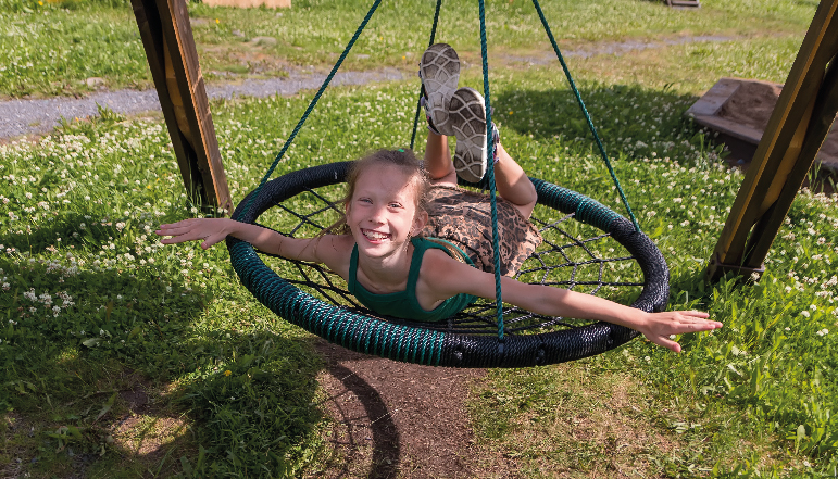 А как привольно будет погулять детям на уличной игровой площадке! Тут вам и качели, и песочница, и горки, и даже маленький домик со ставенками — почти всё рукотворное, сделано старательными мастерами-деревообработчиками Горной Саланги. Прямо как детские площадки в Альпах, что встречаются повсеместно и действуют круглый год!
