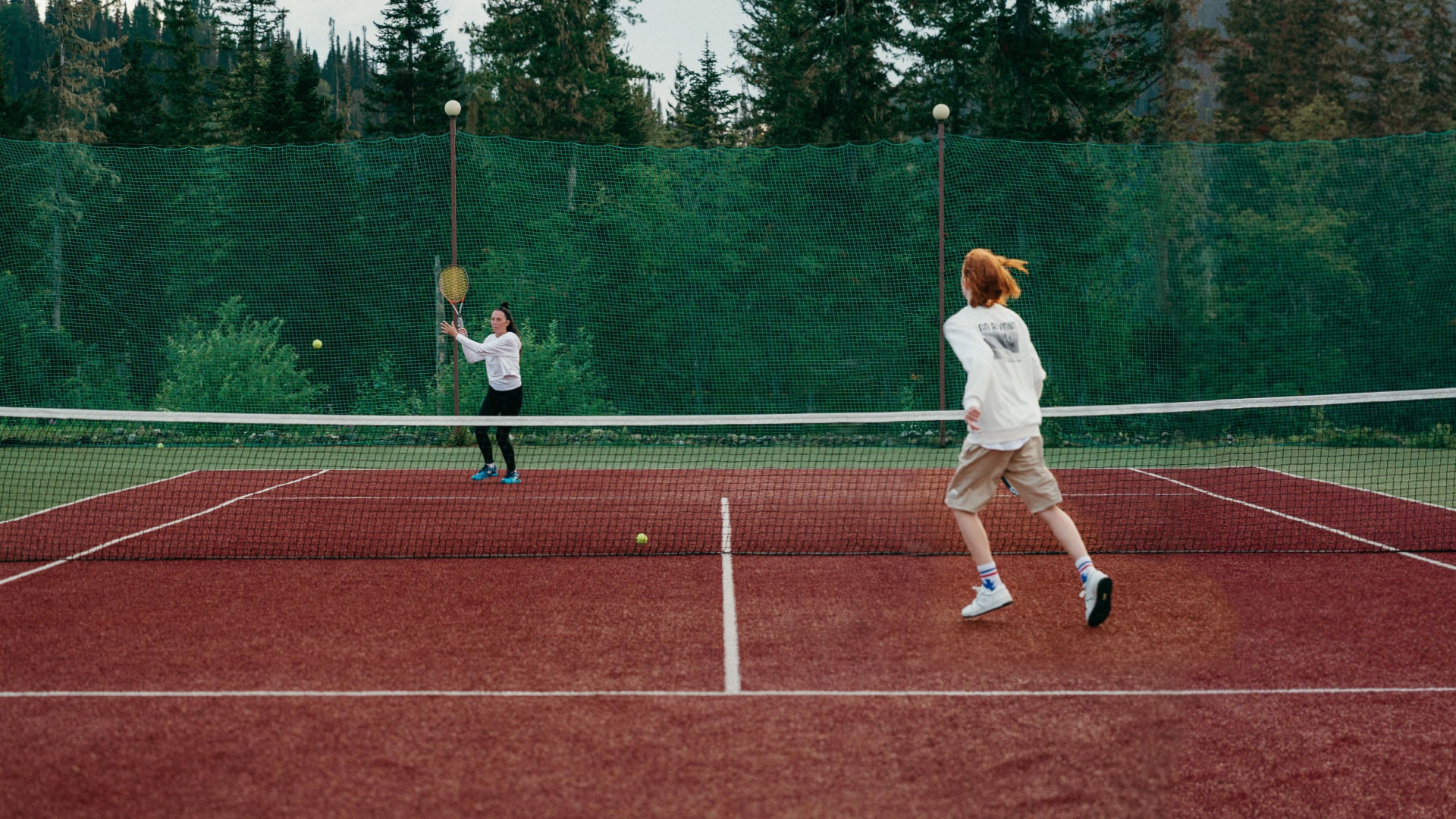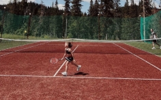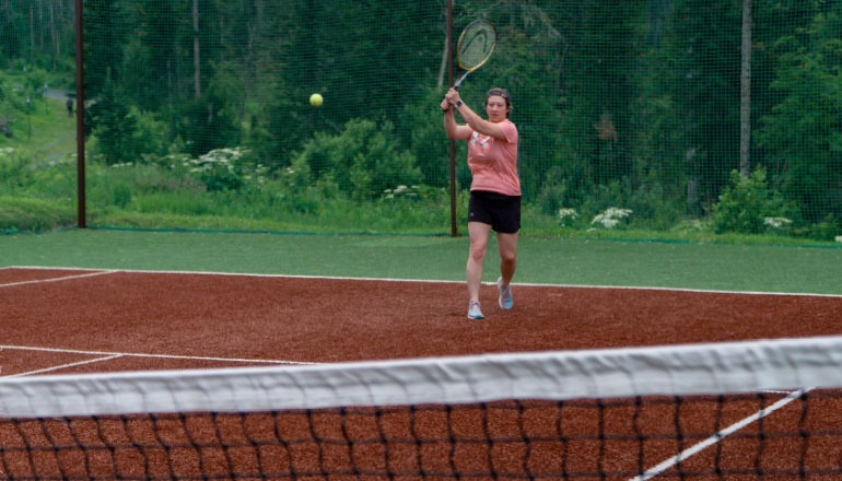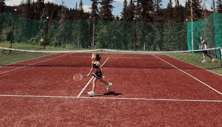 Теперь в Горной Саланге есть отличный теннисный корт — площадка 18х36 кв.м включая забеги, профессиональное покрытие «искусственная трава», разметка, сетка.